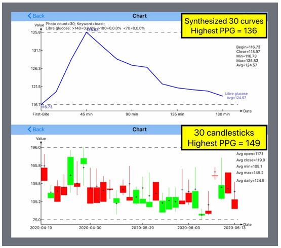 Figure 2 shows primary characters of PPG, such as its waveform (i.e. curve over three hours), maximum value, minimum value, and average value. The top diagram reveals a “synthesized” PPG waveform from 30 toast meals, whereas the bottom diagram depicts these 30 individual candlesticks.3 There are some small deviation existing between the primary values of these two diagrams which resulted from different numerical calculation process. The most important characteristic is the maximum (i.e. highest) PPG values which are 136 mg/dL for synthesized PPG curve and 149 mg/dL for 30 individual PPG candlesticks. These highest PPG values of 136-149 mg/dL are much lower than his previous highest PPG record of around 200 mg/dL resulted from starchy food during 2012-2014.