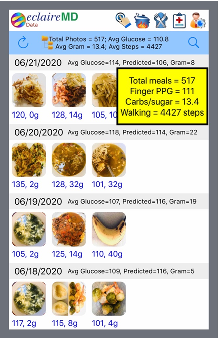 As shown in Figure 3, a photo of total meals, he had a total of 517 meals with a variety of food ingredients. These 517 total meals have an average finger-pierced PPG of 110.8 mg/dL. His average carbs/sugar intake amount of 13.4 grams, and his post-meal walking of 4,427 steps. These 517 total meals’ finger PPG and post-meal walking steps are similar to those 30 toast meals, except for the carbs/sugar amounts which are 13.4 grams for total meals and 21.4 grams for toast meals. Toast meals carbs/sugar amount is 60% higher than average total meals. If using a linear amplification ratefor his calculation, the toast meals finger PPG should be 110.6 * 1.6 = 177 mg/dL which is close to his early PPG of around 200 mg/dL during 2012-2014. This finding proves that his beta cells have been self-repaired for the past 6 to 8 years.