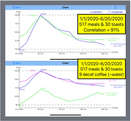 Furthermore, he places his recent PPG results from the 9 decaffeinated coffee meals,4 which is similar to water intake, along with 30 toast meals and 517 total meals. It is evident that the decaffeinated coffee serves as the “lower bound” of the other meals which havedifferent degrees of carbs/sugar iintake, including toast meals.