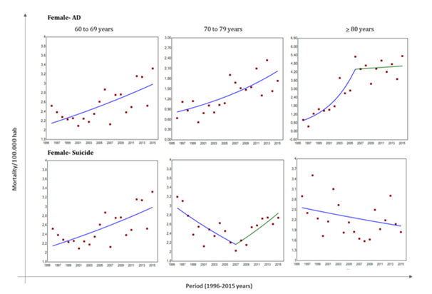 Table 1 shows a synthesis of main data of AD and suicide mortality analysis, describing annual percentage change (APC) and regression significance data according sex and age-groups. In males, AD mortality trend did not change significantly among period analysed here (Figure 2). At contrary, females with 60 to 79 years presented a significant linear increase in AD mortality frequency with an estimated 5.58% increment in AD deaths by year. Oldest-old females follow similar tendency of AD increase mortality until 2006, with higher APC value (near to 20% by year). However, from 2006 to 2015 this trend stabilized, even though AD mortality rates remained higher than observed in younger women (Figure 3).