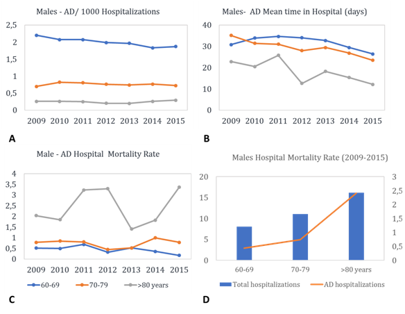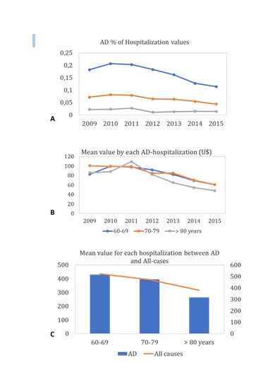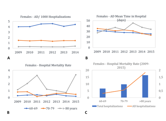 After a brief decline in this frequency, that occur in 2013 year, this indicator started to rise again (Figure 4C). A complementary comparison was performed between all-causes and AD-hospital mortality rate. As can see in Fig. 5D both death groups showed trend to increase according to age, despite the hospital mortality rate to be lower in AD-group than all-cases group.