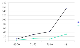 Figure 1 Number of fractures per age range. This figure shows that in both cases, but especially in the group of women, the incidence of falls increases gradually with age.