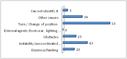 Figure 2 Cause of fall or fracture. In the bars the data show that turn or change of position is the most prevalent cause of fracture in the study population. Also instability is the cause of a high number of fractures. Very few fractures are cause by external factors as footwear.