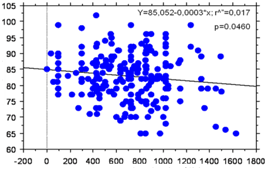 The mean calcium intake was 715.27±312.56 mg/day (range 0- 1635 mg/day). There were no significant differences between men and women, and there was a decrease in this parameter with increasing age (Figure 3). Almost all the men reported alcohol and smoking habits. Although most of them no longer smoked at the time of the fracture and drank moderately (<3 glasses/day), 61% had previously been heavy smokers. With respect to alcohol habits, 18,02% of the patients drink alcohol. Most of those who drink were men (36 from 52 men with fractures) and 18 of then stated that they were ex-heavy-drinkers (34,6%), and four cases were detected of a history of alcoholism.