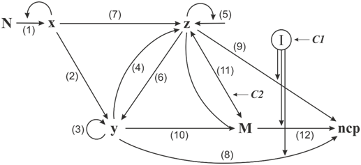 The variables x; y; z represents the epithelial cell population in the a vascular, vascular and metastasis stages respectively, M is the mesenchymal cell population. The parameter k11 of EMT is a flow rate and its value is 0.1.24