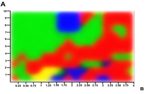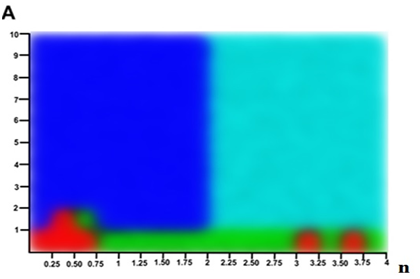 The x axis represents the variation of the frequency values (n) and the y-axis represents the different doses A. The red and green zones are the predominant ones. The second ones represent states with a quasiperiodic dynamic and they do not have a defined oscillation period. They are a possible route to chaos.26 The blue regions are the useful ones, because they reduce the complexity of the system to a periodic state.