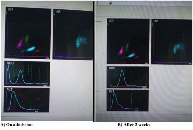 The resulting low red blood cells and hematocrit for the corresponding haemoglobin (at hospitalization 145.0 g / L), combined with high erythrocyte index values, drew attention to a more thorough study of the histograms and flags given as analyser counts. Within 3-4 days there is a decrease in haemoglobin values to low-grade anaemia.