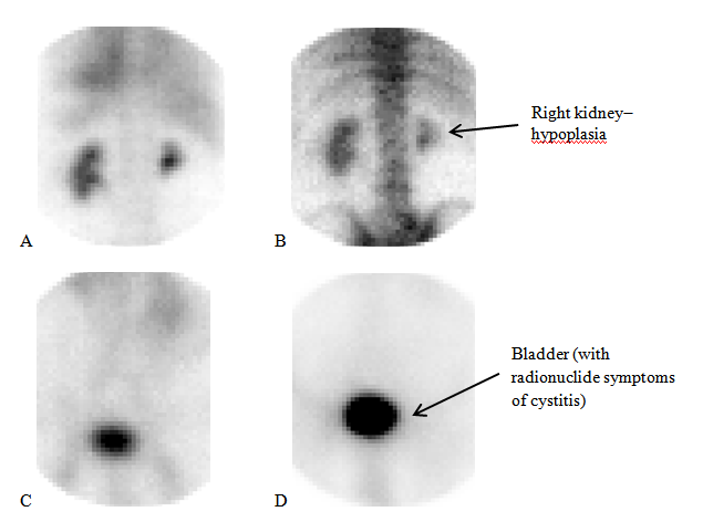 Figure 1 Scintigrams at the SENS-CRS basic test with99mTctechnephore (A–back, B-a forward projection) and the delayed examination (C–back, D-a forward projection). Symptoms of nephrosclerosis of kidneys are visualized: the picture of "a light rim" around the localized accumulation in pelvis is, presumably, caused by a sclerosis of interlobar arteries.