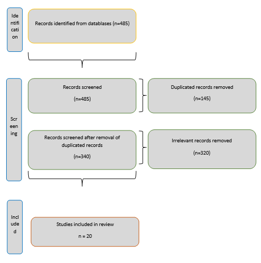 Below is a scheme that shows the search strategy used to select the 20 articles selected from the 6 databases, following the criteria of identified studies, duplicate studies, title, abstract, full text, and valid studies of a definitive nature (Scheme).
