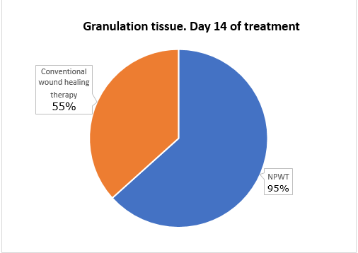The previous studies, together with the study by Wynn M, et al,18 observed that granulation tissue on day 14 of treatment is 95% in patients treated with NPWT compared to 55% with conventional cure therapy of wounds (Graph 1).
