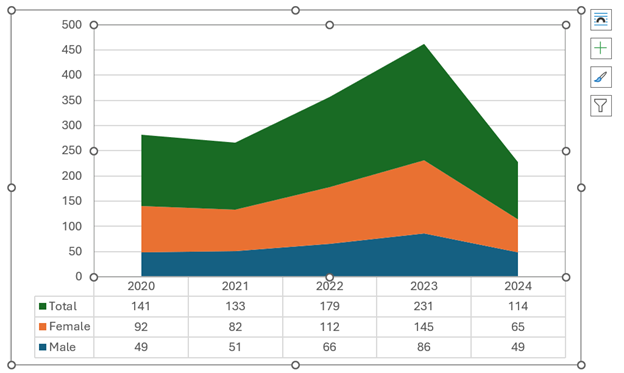 Between 2020 and 2024, there were 41,025 suicide attempts by exogenous intoxication in the Central-West Region of Brazil, with 798 cases in the population over 60 years old, representing 1.94% of the notifications. Figure 1 shows the distribution of occurrences in the elderly, broken down by year and sex. The year 2023 had the highest number of notifications, accounting for 28.9% of the total, while 2024 had the lowest number, corresponding to 14.9% of the records.