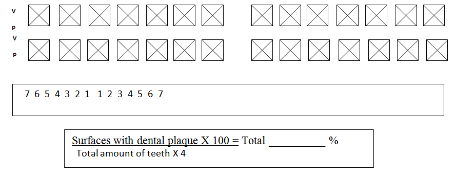 O’Leary Plaque Index (PI) 18 was evaluated by mouth rinsing with 10ml of EVIFORM for 30 seconds, which revealed the tooth surfaces which had dental plaque. The counting of the stained surfaces were multiplied by 100 and divided by the number of teeth divided by 4 (surfaces of the tooth), thus revealing the percentage of surfaces compromised by plaque, being 10% considered satisfactory by the author.