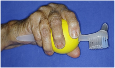As an alternative for cleaning dentures of patients with some motor limitation of the hand, especially in cases of arthritis or after a stroke, adaptation of a device to toothbrush handles can be indicated.1 This device, which can be made from a variety of materials and object, for instance, bicycle handbar mittens, a foam ball used in physiotherapy, among others, increases the volume of the handle and makes it easier to use the brush, thereby enabling the patient to perform brushing by him/her, consequently diminishing his/her dependence and improving self-esteem, thereby contributing to the maintenance of the elderly patient’s functional capacity.