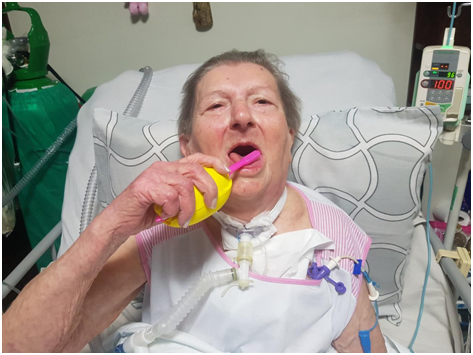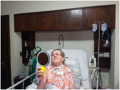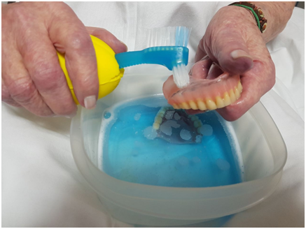 Secondly, once the patient may not be able to move around his room, the sink may be improvised. In this case, a plastic container filled with water and denture cleaner can be a solution, allowing the patient to do his or her hygiene on his or her lap (Figure 2).