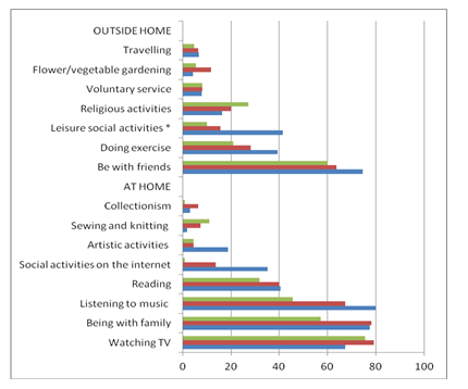Regarding the participation of our sample in society and in leisure activities, we found that they tend to decrease with age. Concerning political participation, the interests of all age subgroups studied is low, however, it was observed that the voting frequency was higher in older adults. Similar results were found for Portugal in the study Active Ageing Index 2014.12 With regard to leisure activities, it was found that as age increases this type of activities become less frequent and that all groups in this community practice more often indoor leisure activities and individually. This raises some concerns, since the likelihood of young people and middle-age adults continuing to perform the same activities in later ages is great13,14 (Figure 1). These data show that it is essential to offer these population opportunities for involvement in physical and collective activities that promote social participation in order to foster active ageing. It was also found that the organizations, institutions and community associations are mostly frequented by different and separate age groups, which means that they offer few opportunities for intergeneration interactions. On the other hand, men showed to perform more leisure activities outside the home, what could be explained by having more free time than women, as the latter devote more time to the family life than men,15 and men are those who have more interest in politics. This field is, par excellence, a field of symbolic power that remains a stronghold of male domination, based on male values and standards.15