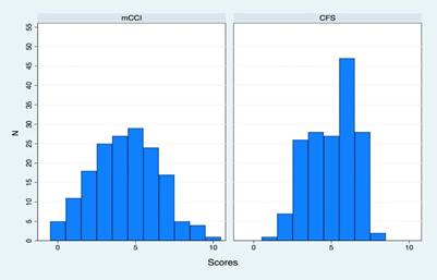 Figure 1 shows the distribution of CFS and mCCI scores. The median CFS was 5 (inter quartile range 4-6) The median mCCI was 4 (inter quartile range 3-6).