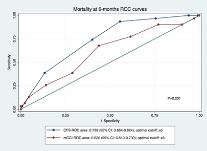 Results: During the study period 166 patients were included. The median age, at time of hemodialysis start, was 75 years ± 6.3 years. The mortality at 6 months was 19% (n=31). For both scales, the analysis of ROC curve, stablished the optimal cut-off to predict the event death at first 6 months as ≥ 5points. The performance of CFS was superior to the mCCI, in fact, the area under the curve was significantly higher in CFS (0.739) versus the mCCI (0.620). A CFS≥5 had a sensitivity/specificity of 94%/44% in prediction the primary outcome. On the other hand, a mCCI≥5 predicts the same outcome with a sensitivity/specificity of 26%/88%. The diagnostic odds ratio for CFS≥5 was 11.6, compared to only 2.7 for mCCI≥5. Lastly, we constructed a model in which both scores interacted (as categorical variables), which after multivariable adjustment showed that mCCI/CFS <5/≥5 and ≥5/≥5 were independent predictors of mortality (HR=7.06; P=0.017; HR=10.708; P=0.002; respectively). Interestingly, no events were observed in the mCCI≥5/CFS<5 group.