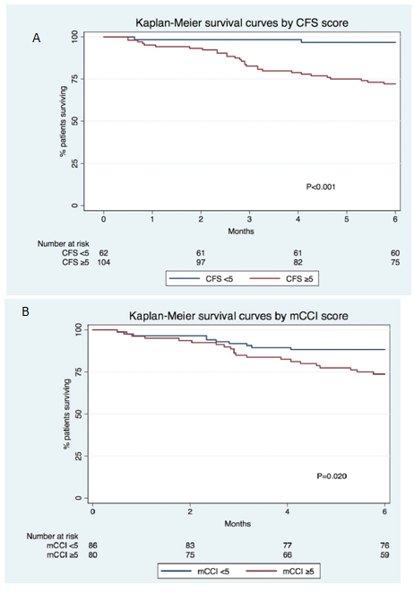 Patients’ survival curves by CFS (≥5 vs <5 at 3-/6-months, respectively: 83%/72% vs 98%97%; P<0.001) and mCCI (≥5 vs <5 at 3-/6-months, respectively: 85%/74% vs 92%/88%; P=0.020) groups are depicted in Figure 3 A & B, respectively. Survival curves stratified by both scores are shown in Figure 4, both groups with CFS≥5 had worse survival, independently from the mCCI score.