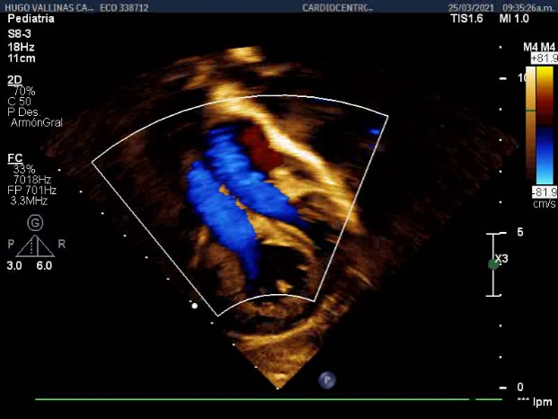 Eleven-month-old male, white, with prenatal diagnosis by Transposition Echocardiography of the Great Arteries; in which anatomical correction surgery was contraindicated due to early detraining of the left ventricle, which was under outpatient follow-up to carry out the planned surgery (Surgery ofMustard), previous Rashkind and with previous medical treatment for his underlying heart disease with Furosemide (10mg), aldactone (12mg) and Digoxin (40Mcg); At seven months of age, she began with an acute respiratory picture of light polypnea, nasal discharge with obstruction, intercostal drawing, and SO2 of 73%. Ag test and PCR were performed withpositive results and his hospital admission was decided with a positive Covid-19 diagnosis. He was admitted to a Pediatric Intensive Care Unit since a history of congenital heart disease is a risk factor associated with severe clinical forms and complications.14