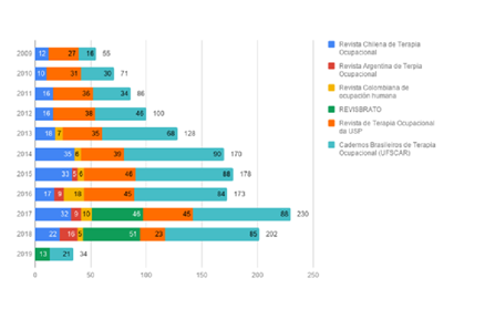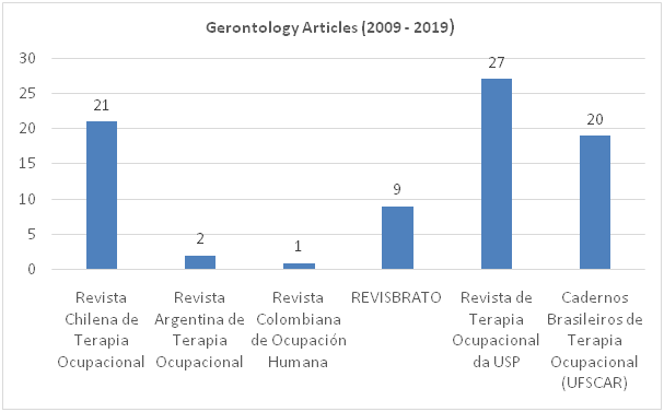 Brazilian production stands out from other South American countries, which is due to the fact that it has the largest number of journals, almost all indexed in the LILACS database (Latin American and Caribbean Health Sciences Literature), and one of them newly indexed in Scielo. Except for Brazilian journals, only the Chilean Journal of Occupational Therapy is indexed in the LILACS database and is in the process of claiming its indexation in Scielo (Scientific Electronic Library Online). The articles in the area of gerontology addressed different subjects, which denotes the interest of occupational therapists for various aspects inherent to aging.