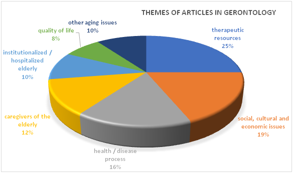 Of the 1225 articles published by the journals considered in the study, 80 were in Gerontology. After analyzing the content of the abstracts, they were categorized around 7 main themes: “Therapeutic Resources”, “Social, Cultural and Economic Affairs”; “Health/Disease Process”, “Caregivers”, “Institutionalized/Hospitalized”; "Quality of life" and “other aging issues” (Figure 1) (Figure 2) (Figure 3).