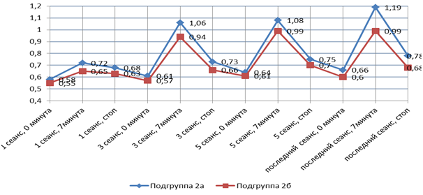 When conducting multiple comparisons during the next sessions of gravitational therapy with nominal modes of rotation of 36-38rpm, the monitoring of ABI showed more significant changes in the macrohemodynamics of the lower extremities. During the third session, a more pronounced increase in the median ABI was noted, with the most significant in subgroup 2a - by 74% (p=0.00001) from 0.61 to 1.06 (during the hypergravity session ), and in subgroup 2b - by 65 % (p=0.002) from 0.57 to 0.94 (during the hypergravity session ). From session to session, there was a trend towards an increase in the median of the ABI indicator, which was measured before the session of gravitational therapy (Figure 1).