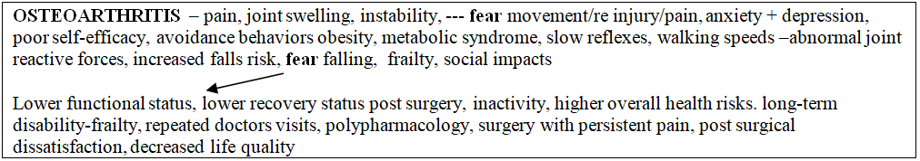As well as possibly increasing the costs of care, plus the need for more extreme or invasive forms of treatment, a parallel contribution of unremitting fears and negative counter behaviors leading to possible heart strain, high blood pressure, and/or depression, plus obesity, increased falls risk, low self-efficacy, need for opioids, sleep disturbances, and the associated risk of frailty can be predicted to further hasten the rate and magnitude of any prevailing joint destructive processes, even in the face of most recommended management strategies and possible surgery, if ignored.
