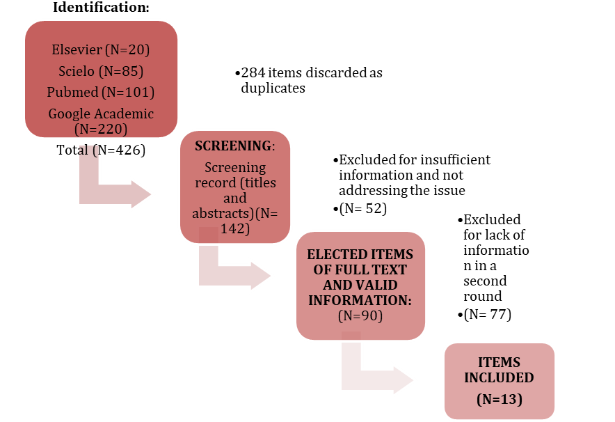 To carry out the selection of these studies, a first bibliographic search was carried out, from which 426 articles were obtained. After applying the inclusion and exclusion criteria, a total of 142 articles were identified. Subsequently, after eliminating duplicate and irrelevant articles both for their abstract and for their title, 45 articles were selected. Of these articles, 32 were excluded because they did not provide relevant information of interest, so that the studies selected for this review were 13 articles.