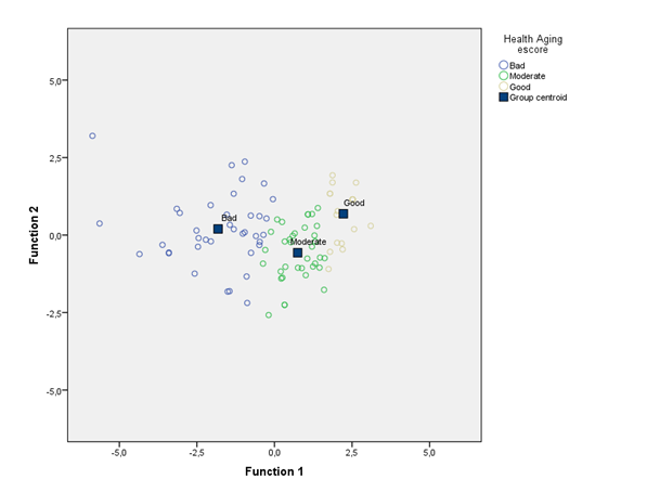 The answers of the elderly to 13 questions about predictors of healthy aging are shown in Table 1. In the canonical discriminant analysis (Figure 1), the test to measure the global significance demonstrated that the first function explains in 91.5% the division of the score into three levels of healthy aging with statistically significant significance (p<0.001) with 85%correlation validating the separation between levels.