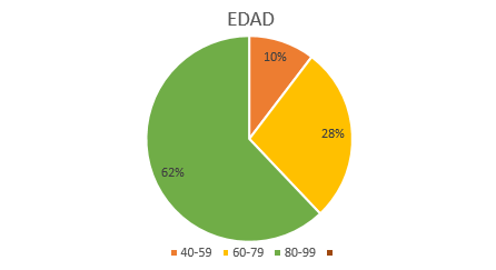 When obtaining the data of the 29 geriatric patients, the following results were obtained; 3 patients (10%) are within the age group of 40-59 years, 8 patients (28%) are within the age group of 60-79 years, and 18 patients (62%) are within the age group from 80-99 years (Figure 2).47