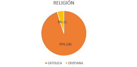 When collecting the general data of the elderly who are inside the nursing home, the following results were obtained regarding their religion: there is a higher prevalence of patients with a Catholic religion with a number of 28 patients representing 95% compared to the Christian religion presenting 5% with 1 patient (Figure 3).48