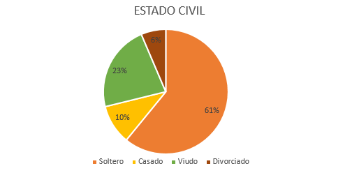With respect to the data obtained in the investigation of the elderly, the following data was obtained regarding their marital status: 19 people representing the majority are single, representing 66%, 7 people are widowed with 24%, 2 people are divorced, with 7% and 1 person is married to 1% (Figure 5).50