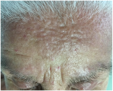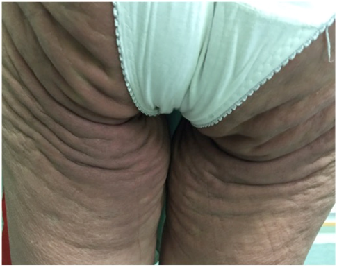 A 75 year-old woman who reports eight months of painful lesions located in her face (Figure 1) back and thighs. On physical examination she presented multiple erythematous plaques and grouped papules, as well as skin infiltration, highlighting the presence of excessive folding on the back and posterior areas of both thighs (Figure 2). Several skin biopsies showed a normal epidermis, dermis with diffuse mucinosis, and numerous fibroblasts and scattered histiocytes without atypia, consistent with scleromyxedema. Protein electrophoresis and immunofixation in blood were compatible with multiple myeloma. This study was performed at Red Salud UC-Christus, Santiago, Chile by the Department of Dermatology. The patient was referred to a hemato-oncologist of our institution for the treatment of her myeloma. She allowed us to publish her case.