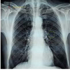A. CXR film-PA view was done on the day of the ICU admission showing small left hailer ground-glass opacity (lime arrow).