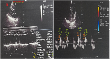 B. Later Echocardiography was done showing a good LV systolic function of an EF of 68% (lime arrow and circle) and grade I diastolic dysfunction (light blue and orange arrows).
