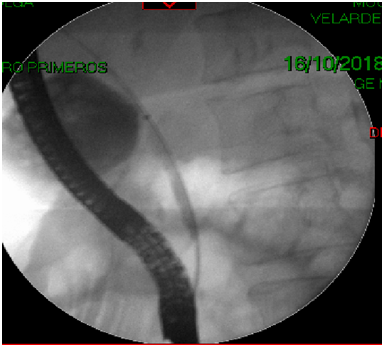 68-year-old female with presence of secondary hypothyroidism 8 years of evolution in treatment with levotiroxin, systemic hypertension 2 year of evolution treated with losartan, thyroidectomy 8 years ago, c-sections 243 and 38 years ago, the patient denies the use of alcohol or tobacco. Initiates with sudden transitive pain in epigastrium, vomiting several times, undergoing imaging and laboratory tests diagnosing pancreatitis its determined that the patient is in need of a ERCP, which is performed at a private institution, during the procedure the major duodenal papilla is identified anatomically normal but without bile output with multiple cannulation attempts (Figure 1), continuing with procedure applying contrast appreciating two gallstone suggesting images in distal choledocus which measures 9 mm in diameter (Figure 2) with a probable stenotic area in the distal portion, a wide sphincterotomy is performed with posterior passing of extraction balloon doing multiple sweeps obtaining two 7 mm gallstones due to said area of stenosisa 10 fix 10 cm stent is placed towards the right hepatic duct. After the procedure the patient presents moderate to intense pain in right hypochondrium alongside hypotension, administrating crystalloids and vital sing stabilization ordering CT scan where a sub capsular collection is visualized, varying heterogenicity from 600 to 20 HU, highly suggestive of a serohematic component with approximate size of 17 by 13.8 by 6.5 cm, with approximate volume of 820 cc (Figure 3) (Figure 4) with diagnosis of a probable subcapsular hematoma, with later presentation of acute kidney failure requiring temporary renal substitution therapy, once she was hemodynamically stable its moved to our unit to continue treatment, taking laboratory exams determining hyperbilirubinemia, due to conjugated bilirubin and elevated liver enzymes, deciding to do new CT scan where a 20% diminution of hematoma size is appreciated and adding pleural effusion to the findings deciding to give a conservative management, eight days later performing control ultrasound finding hematoma with a tendency to re absorption .