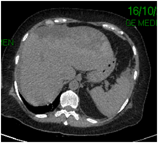 Clinically patient had normocytic normochromic anemia, besides abdominal pain in right hypochondrium respiratory distress due to bilateral pleural effusion which was treated with supplementary oxygen The treatment of the hematoma was merely conservative with strict follow up of hemodynamic and respiratory patterns, blood and plasma transfusions and wide spectrum antibiotics, pleural effusion did not merit invasive management, radiological follow up was performed during the following weeks noticing progressive hematoma reabsorption