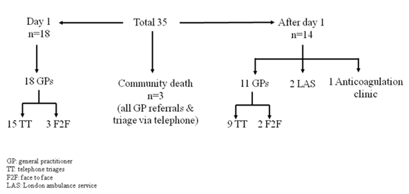 There is evidence that prompt face-to-face assessment is superior to telephone triages ataverting poor outcomes.10 GPs constituted 70% of the referrals during the timeframe of the audit, of which approximately 75% were telephone triages and the rest were F2F consultations. Of the 35 patients who died, 32 (91%) were GP referrals. Of these,27 (84%) were telephone triages and 5 were after F2F consultations. However, F2F consultations from GPs may have been under-represented. There are patients who, after a GP consultation, may be found to be very unwell and sent straight to hospital thus by passing STARRS. The superiority of face-to-face assessment to telephone triaging will be a significant factor to audit with the increased rollout of virtual consultations in the current Covid-19 pandemic.11