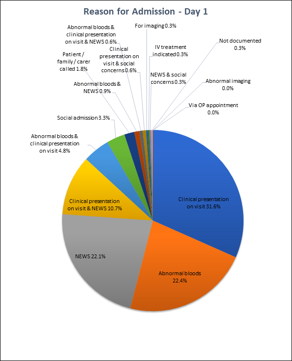 Community management is increasingly thought to be an effective way of providing high quality care for patients with the advantage of avoiding costly hospital admissions and improving patients and carers’ satisfaction.1,2 Furthermore, facilitating home-based healthcare may help to avoid many hospital acquired infections that are common once a patient is admitted into hospital.3These factors are all important, especially within geriatric services where patients are increasingly complex and frail with varying comorbidities4, and where there has been a call for increased efforts for advanced care plans to be prioritized.4,5 Naturally, with an ageing population within the United Kingdom6, community services will likely play an increasing role in offering patients effective medical management by acting as an intermediary between primary and secondary care.7 Currently there is scarce data and literature analysing the utility of these community services in sicker patients who will inevitably go on to require hospital care when initial community management proves to be insufficient. This study aimed to view these cases and assess whether there is a difference in mortality and length of stay for patients who are admitted on the first day of their community management versus patients who are admitted at a later point, with the length of stay serving as a marker for disease progression by the time of admission. The study also investigates common reasons for hospital admission from within the community.