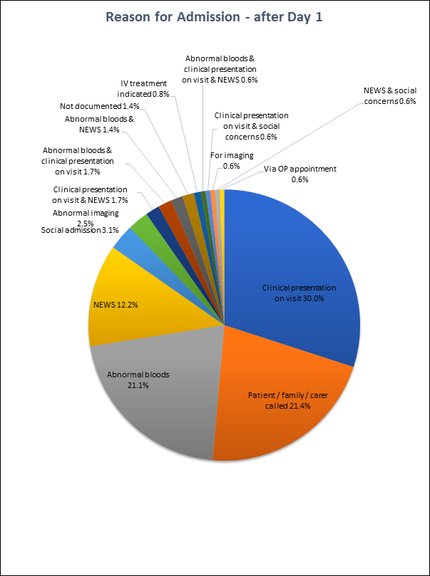 Within both cohorts of patients, the most common reasons for hospital admission were clinical presentation and/or abnormal blood results. A breakdown of the reasons for admission within both groups are graphically represented in Charts 1 and 2.