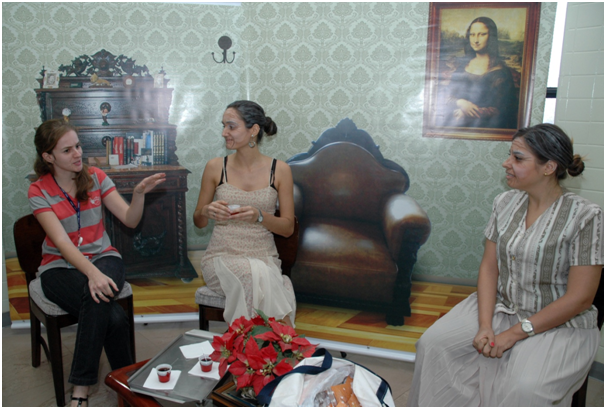 The scene was elaborated to be easy to transport, and it was constituted by two banners stamped with a picture of a room with old mobile and wallpaper, as well as old scene accessories, like chairs, a center table, a tray with teacups, a suitcase and a portrait. Objects that were adapted in the local was also used (Figure 2).