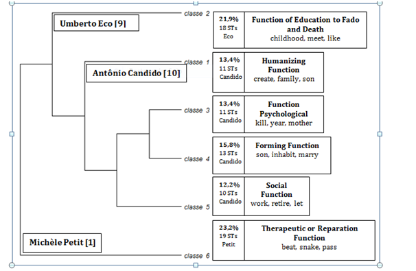 The Dendrogram (Figure 1) shows the percentage of each class, followed by the number of text segments (STs) that make up the class description. On the side, it follows the titles of the classes that were categorized according to the inference of the semantic content of the participants' speeches, as well as the words of greater association with the said class, according to the coefficient obtained in the chi-square association test. It is noteworthy that this categorization was structured from the reading functions of literary texts proposed by Petit,1 Eco9 and Candido10: Class 01: Humanizing Function; Class 02: Function of Education to Fado and Death; Class 03: Function Psychological; Class 4: Forming Function; Class 5: Social Function; Class 6: Therapeutic or Reparation Function.