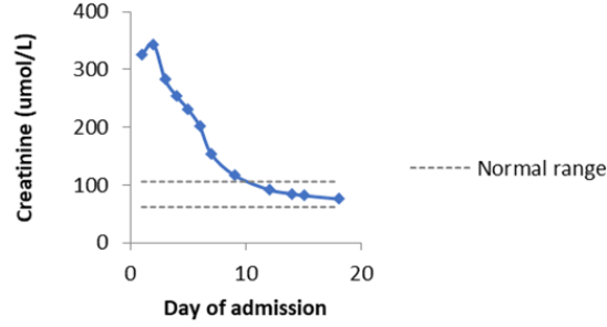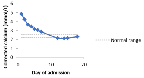 Calcium and vitamin D supplements were stopped. She was treated with slow intravenous fluids, and subsequently intravenous pamidronate. She also received antibiotics to cover potential infective exacerbation of COPD. Over the course of her admission, her mental state improved and her AMTS was 10 out of 10. Herrenal function and serum calcium also improved prior to hospital discharge (Figure 1). At four months post discharge, the patient has remained well with a normal serum calcium of 2.49 mmol/L and an elevated PTH 16.6pmol/L.