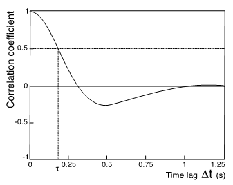 The parameter value is that of the abscissa ( τ ) of the 0.5 crossing of the autocorrelation curve of the time function of the acceleration of the center of gravity of the subject. Only part of the autocorrelation is represented. This rigorous definition requires some explanation.