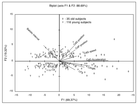 The names of the eight independent variables are written to the extension of their axis. Both cohorts are clearly distinguished along the first axis, highly correlated to the acceleration of the center of gravity (0.965). The study of the temporal evolution of this acceleration during the recording confirmed the presence of the acceleration peaks described by Lakie et al.15