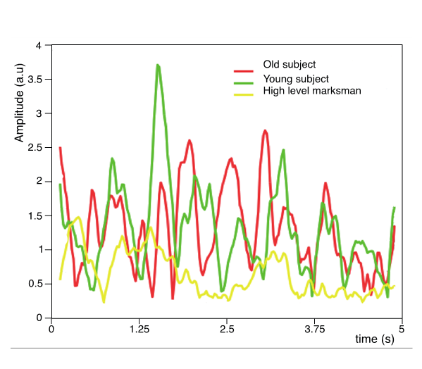 Comparison of these peaks in different populations showed that they were much more frequent in the elderly than in the young (The amplitude of the peaks is lower in the elderly subject). In high-level athletes, the evolution of these peaks could only be studied in a single Olympic rifle champion at ten meters in room16 the interval between the peaks is much longer and their amplitude is much smaller (Figure 3)