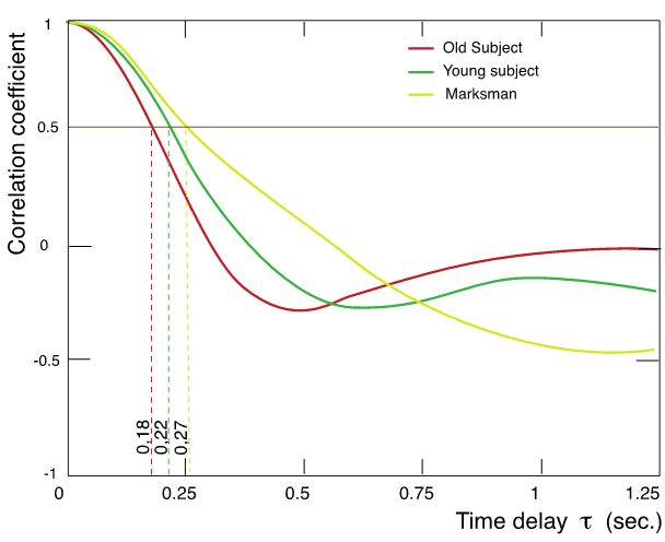 The autocorrelation represents the evolution of the correlation coefficient (ordinates) of different values of the time function of the acceleration, separated by increasing intervals of time (abscissa). The coincidence of the duration of these autocorrelation intervals with that of the intervals between the peaks of acceleration does not occur at the same tag lag in the different populations (Figure 4). The comparison of these differences in 152 subjects from different cohorts (116 young subjects, 35 elderly subjects, 1 firing champion) found that the dispersion of the time lag according to the cohorts was maximum when the correlation coefficient of the autocorrelation went through the value 0.5 for the first time.