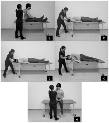 a: Patient is seated, operator behind, oscillator applied. b: Move patient from a sitting to a reclining position. Extend patient's head over the end of the table at 45° angle c: Tum the patient's head to the opposite side. d: Roll the patient over onto that side. The head is slightly angled while the patient is looking down at the floor. e: While head is kept turned right, patient is brought to sitting position.9,11 Finally head is turned forward.