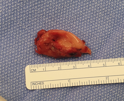A 61-year-old gentleman, right hand dominant, previously healthy presented for a two-year history of left wrist pain and numbness that gets worse at night. A clinical diagnosis of carpal tunnel syndrome was made and confirmed by nerve conduction studies. The patient was started on conservative treatment that failed. A consensual decision was done to perform a mini open carpal tunnel release. The surgery was done using a mini transverse incision over the distal wrist crease. The antebrachial fascia was opened, and the transverse carpal ligament was successfully released; the patient was sent home on day 0 post op. The patient presented 3 weeks post op due to a hematoma in the palm and 10 cc of blood were aspirated from the supposed hematoma. Two months post op, the patient presents to the clinic with a painful pulsatile mass in the palm. An ultrasound doppler was done and revealed a (2.7cm x 1.6cm) pseudoaneurysm of the superficial palmar arch. The patient was scheduled for a pseudoaneurysm repair. Intraoperatively, the pseudoaneurysm was identified in the superficial palmar arch (Figure 1 & 2). The vascular branches were small in size; thus, they were ligated. The mass was reported as having a fibrotic vascular wall with reactive changes that is consistent with the diagnosis of a pseudoaneurysm of the palmar arch. The patient had complete resolution of his symptoms immediately post op and no recurrence of symptoms at 12 months post op.