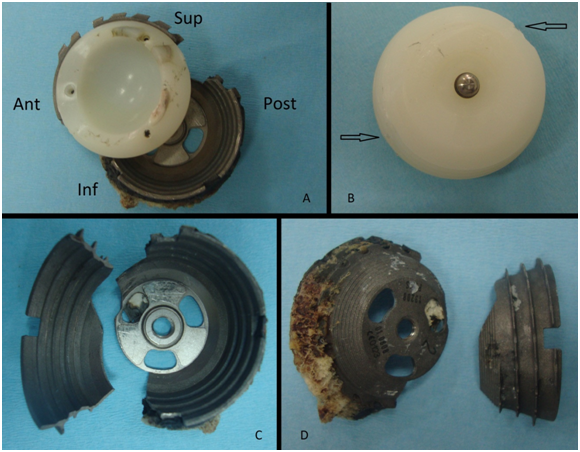 This is contrary to our findings, in which the defect was anterior-superior (Figure 4A). Our patient has been neglecting her follow-ups, since she had no clinical problems with her hip, up until the day the cup failed. The fact that almost two third of the circumference of the cup were well osteointegrated and thus were rendering the cup stable, may have been the reason why the patient had a well-functioning hip replacement without any complaints. The anterior-superior part of the cap fractured due to repeated loading of a non-osteointegrated area, secondary to the lack of bony support. We believe that the mechanism of fracture is superior stress loading of a partially well fixed cup, on its inferior side, transforming compressive loads from the femur to shearing stresses, for a longer period of time. All the other cases reported are early to mid-term failures compared to our patient, which was a late case of fracture.